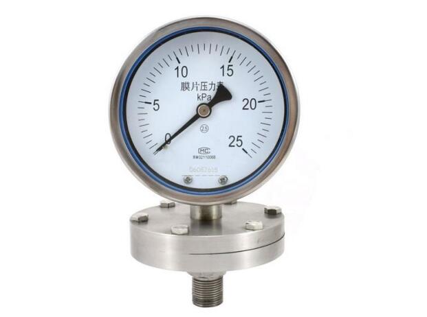 膜片壓力表能適用于測量強腐蝕、高溫、高粘度、易結晶、易凝固、有固體浮游物的介質(zhì)壓力以及必須避免測量介質(zhì)直接進(jìn)入通用型壓力儀表和防止沉淀物積聚且易清洗的場(chǎng)合,應必須采用由隔膜隔離器與通用型壓力儀表組成一個(gè)系統的隔膜表。