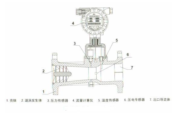 1、旋渦發(fā)生體 2、殼體 3、智能流量計積算儀 4、溫度傳感器 5、壓力傳感器 6、壓電晶體傳感器 7、消旋器
