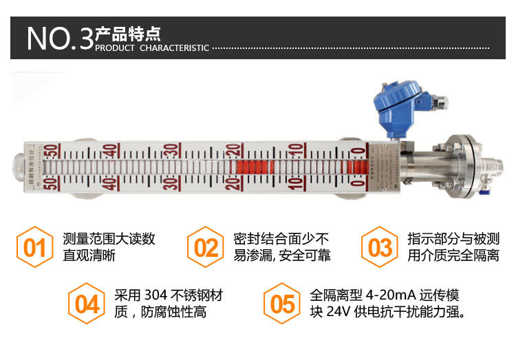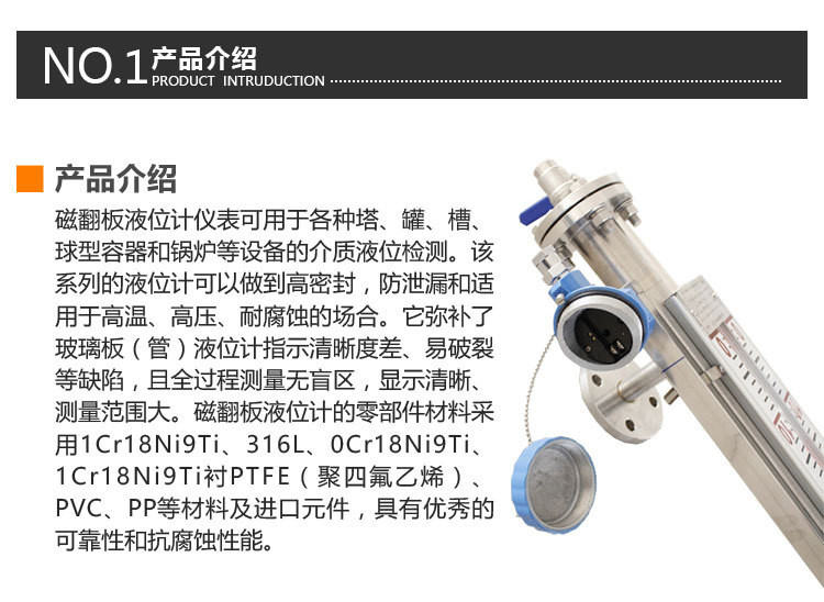 磁翻板液位計儀表可用于各種塔、罐、槽、球型容器和鍋爐等設備的介質(zhì)液位檢測。該系列的液位計可以做到高密封,防泄漏和適用于高溫、高壓、耐腐蝕的場(chǎng)合。它彌補了玻璃板(管)液位計指示清晰度差、易破裂等缺陷,且全過(guò)程測量無(wú)盲區,顯示清晰、測量范圍大。磁翻板液位計的零部件材料采用1Cr18Ni9Ti、316L、OCr18Ni9Ti、1Cr18Ni9Ti襯PTFE(聚四氟乙烯)、PVC、PP等材料及進(jìn)口元件,具有可靠性和抗腐蝕性 。